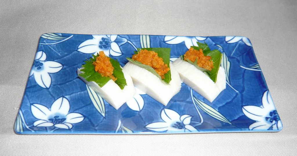 4 かまぼこの切れ目に青じそと、うに(適量)をはさむ。